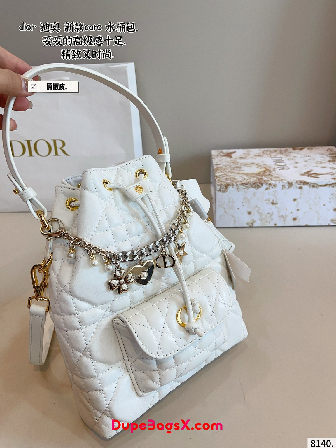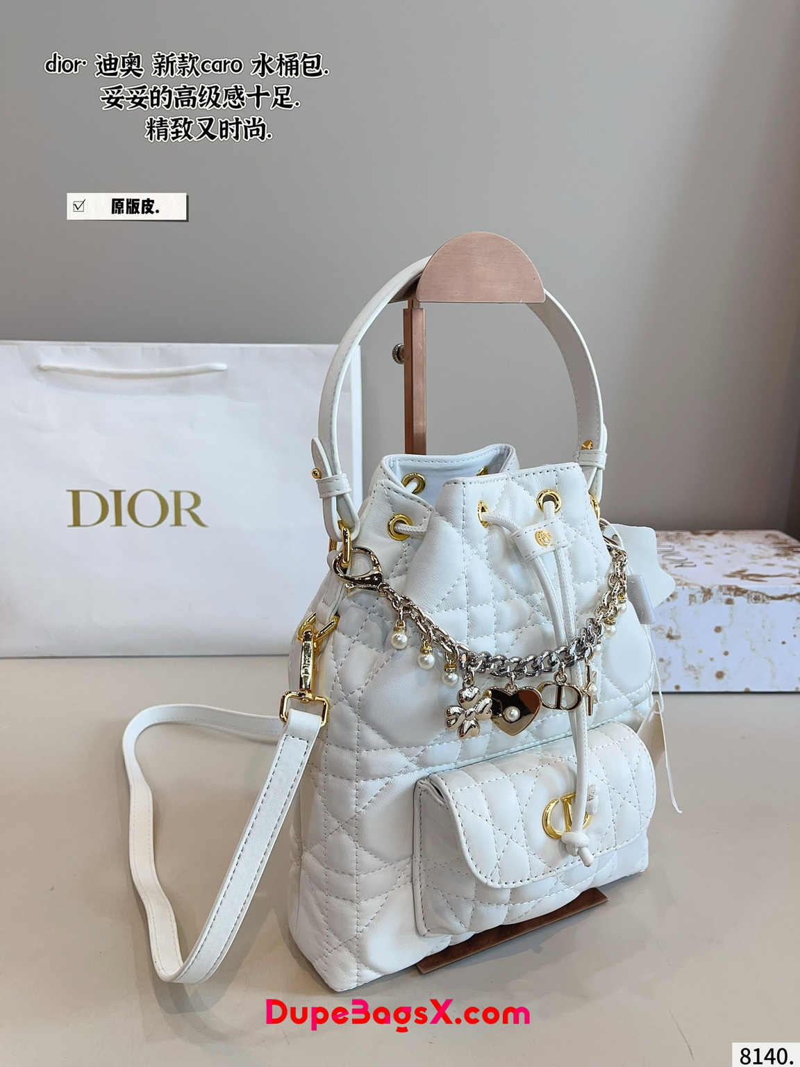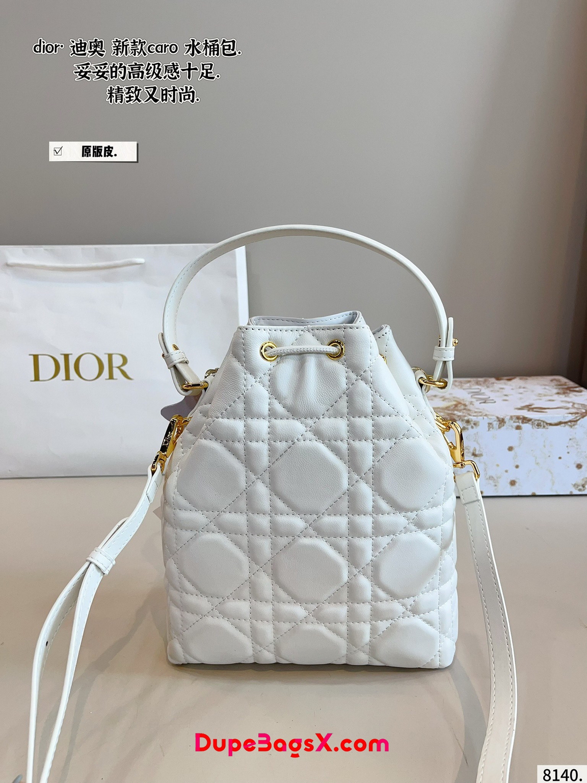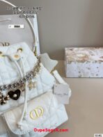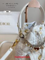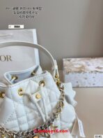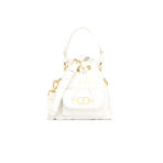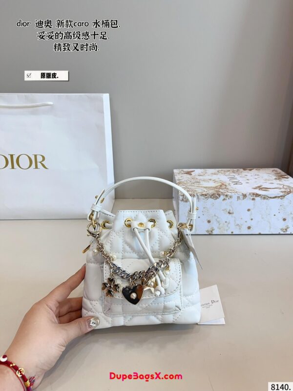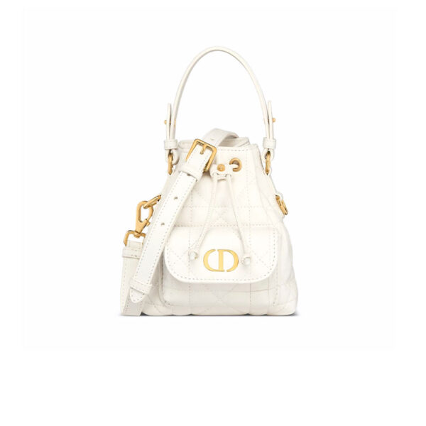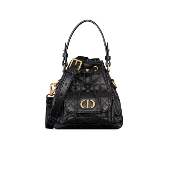 New for Fall 2025, the Dior Caro bucket bag embodies modern and elegant style. Crafted in powder pink lambskin elevated by Macrocannage topstitching, the design features a drawstring compartment. The front flap pocket adorned with an antique gold-finish metal CD signature allows it to hold all the small essentials. Thanks to the removable top handle and adjustable, removable strap, the miniature bucket bag can be carried by hand, worn over the shoulder or crossbody.