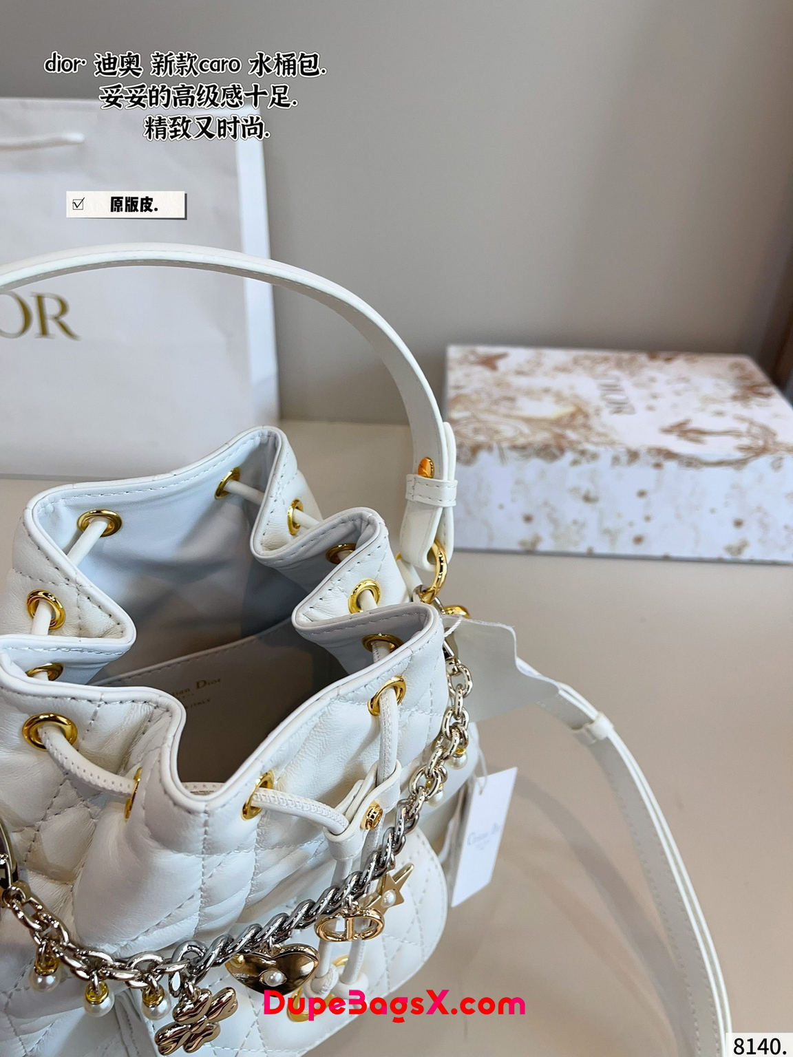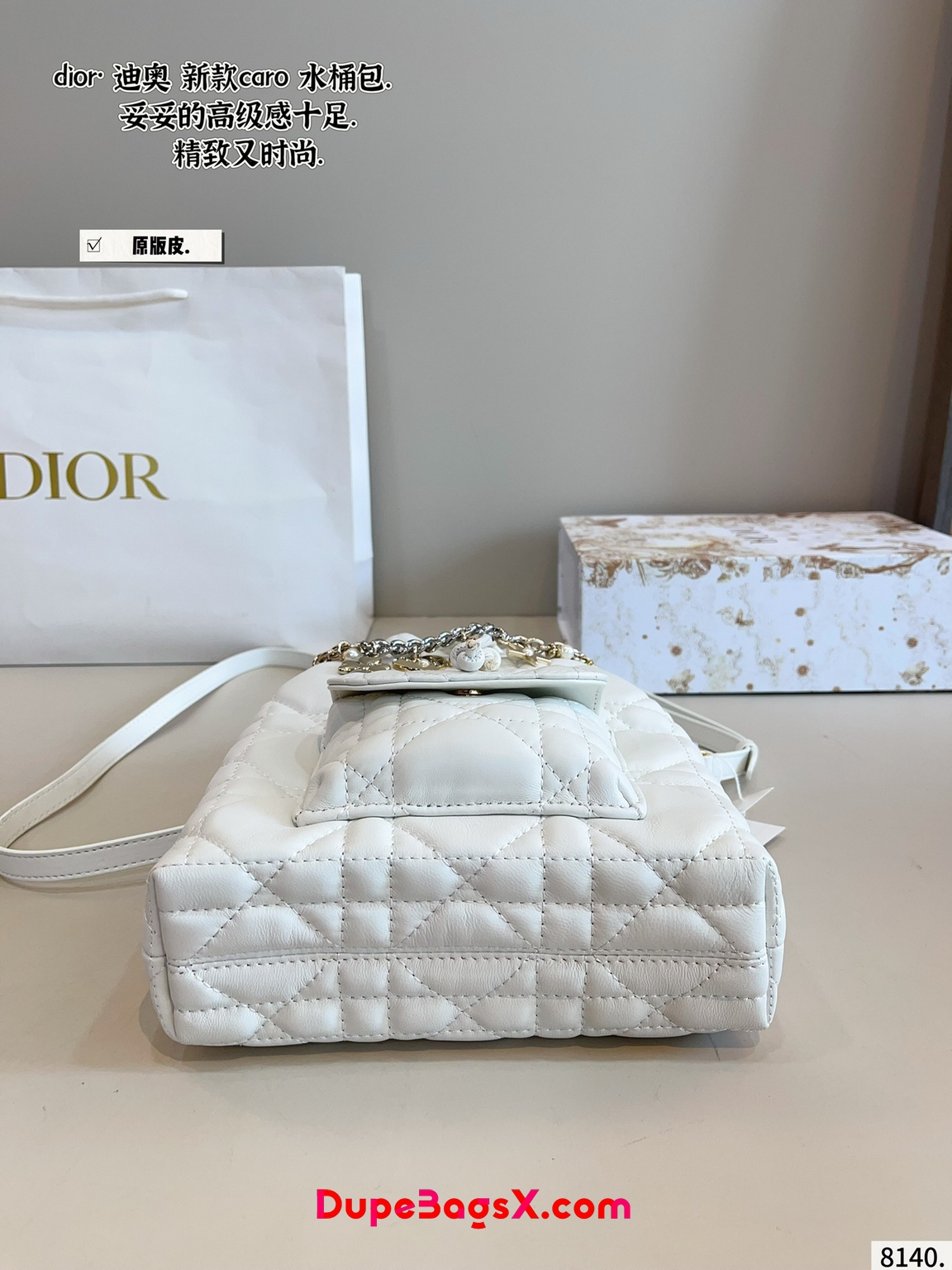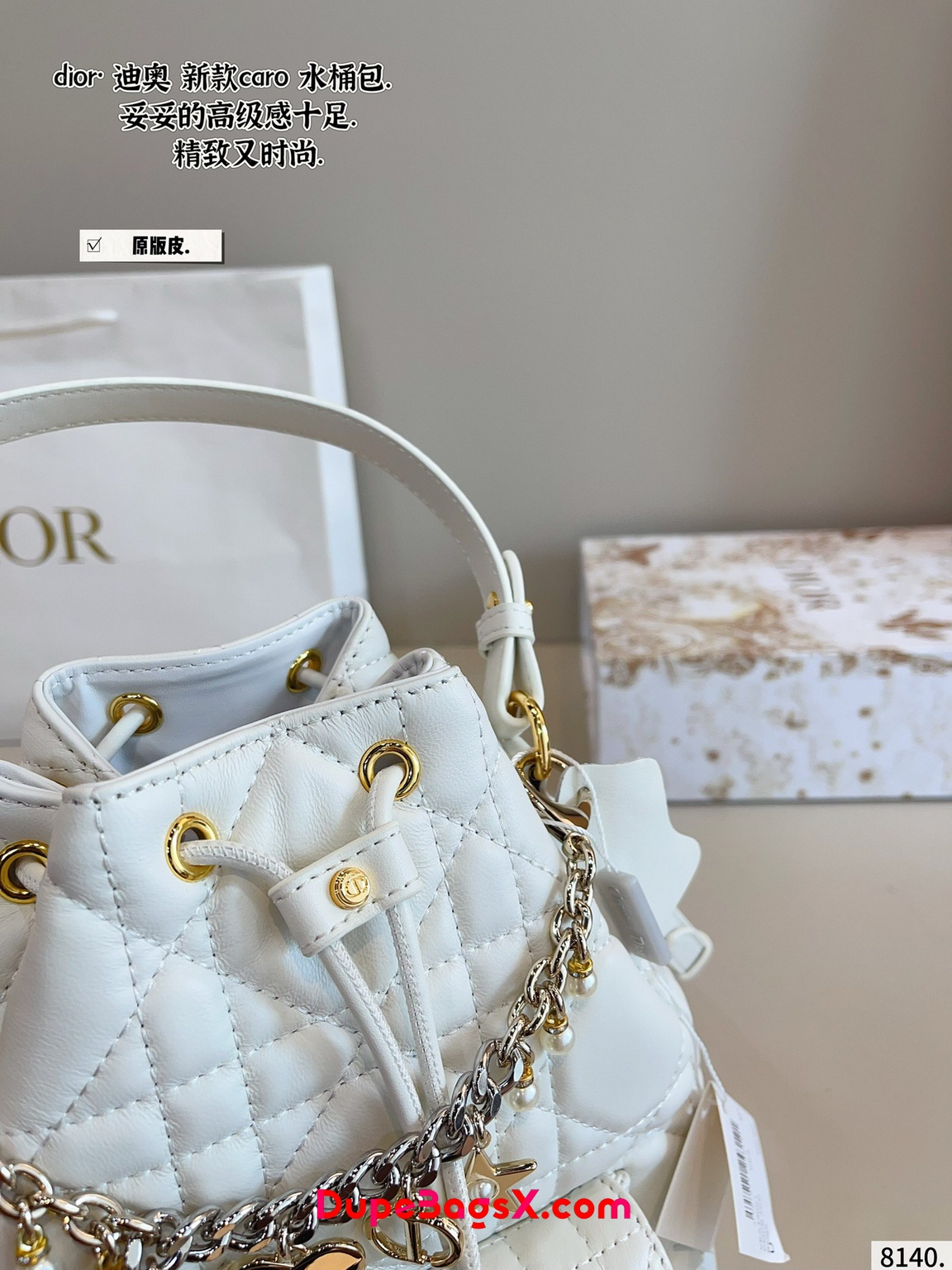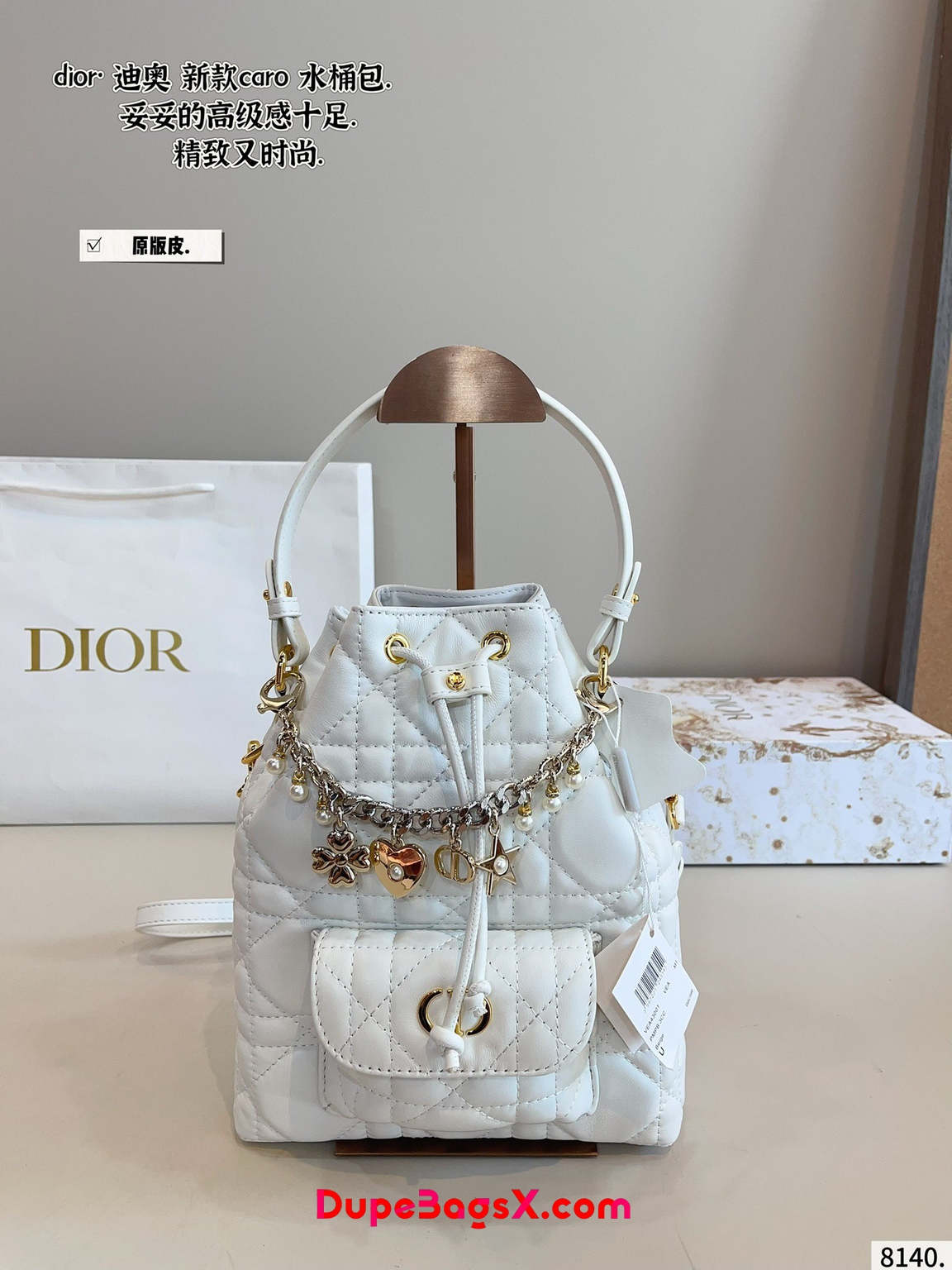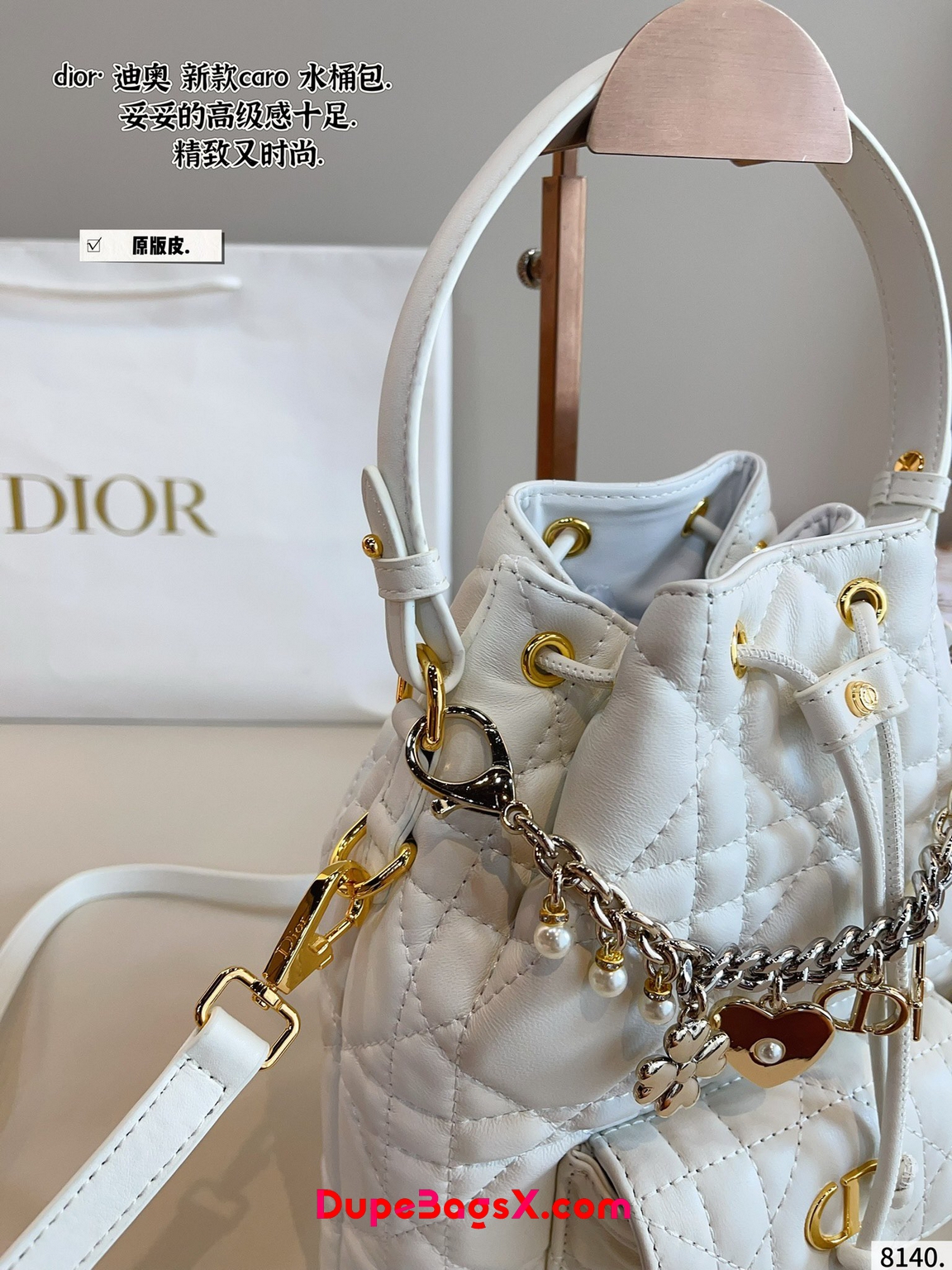 New for Fall 2025, the Dior Caro bucket bag embodies modern and elegant style. Crafted in powder pink lambskin elevated by Macrocannage topstitching, the design features a drawstring compartment. The front flap pocket adorned with an antique gold-finish metal CD signature allows it to hold all the small essentials. Thanks to the removable top handle and adjustable, removable strap, the miniature bucket bag can be carried by hand, worn over the shoulder or crossbody.